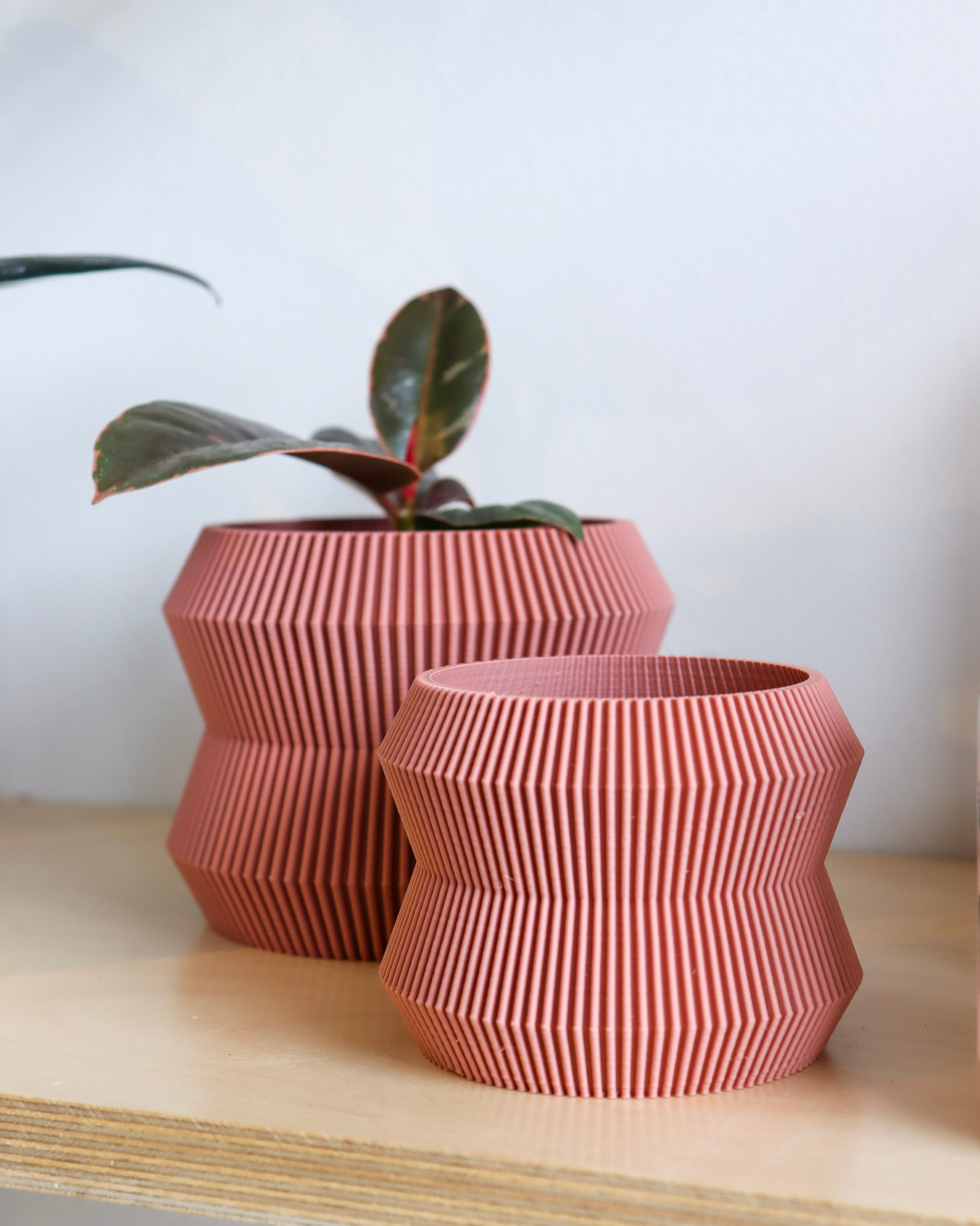 Cache-pot fabriqué avec du bioplastique à base maïs et de bois recyclé.